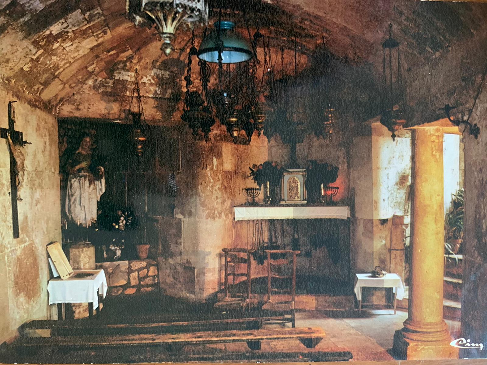 Photographie, ensemble de la crypte sous M. et Mme Villain montrant les différents meubliers présents pour le culte : bancs, croix sur le mur nord, lampes à huile au plafond, tables avec nappes…